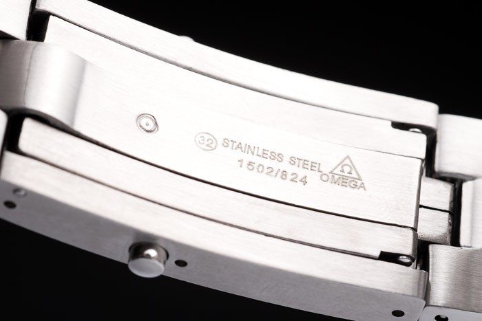 Crown: Børstet rustfrit stål cutwork krone med omega logo plus en ekstra krone på det modsatte øverste hjørne