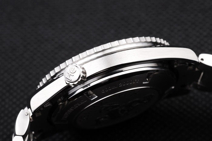 bezel: Sort emaljeret børstet rustfrit stål cutwork bezel med lysende minutter Markører i diameter: 51 x 44 mm