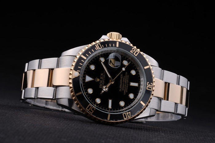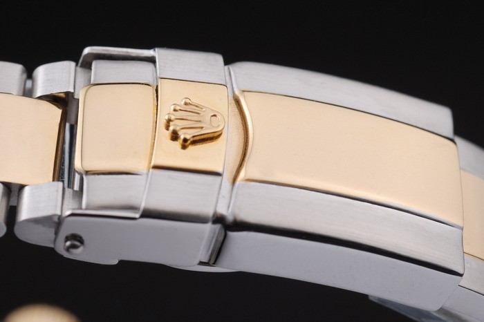 Armbånd: To tonet børstet og guld tone rustfrit stål link armbånd med Rolex gravering fold i lås, der viser Rolex logo